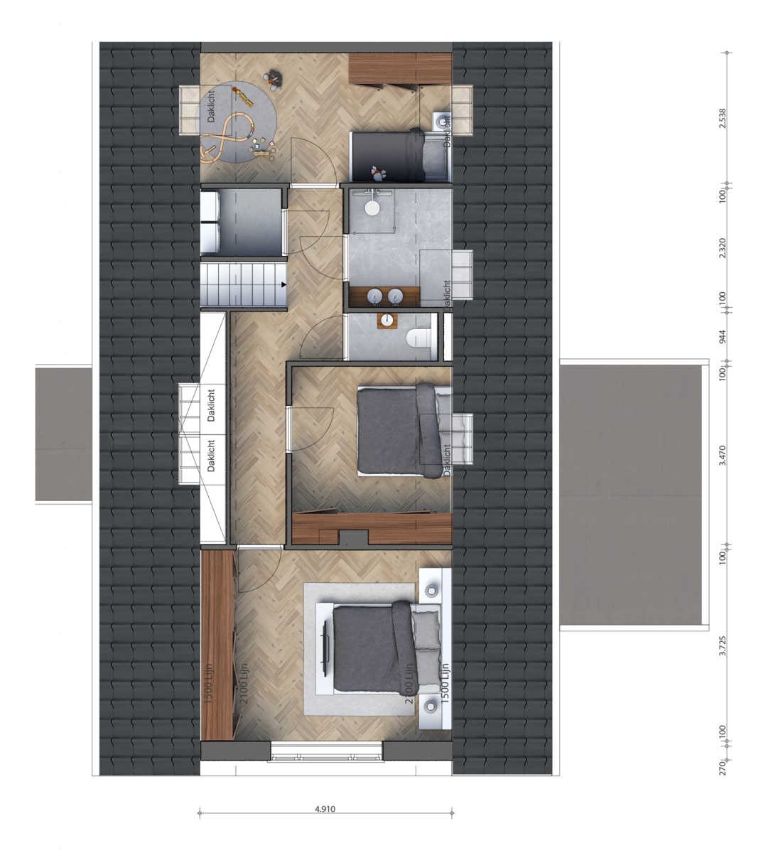 - Drie slaapkamers en een badkamer op de 1e verdieping